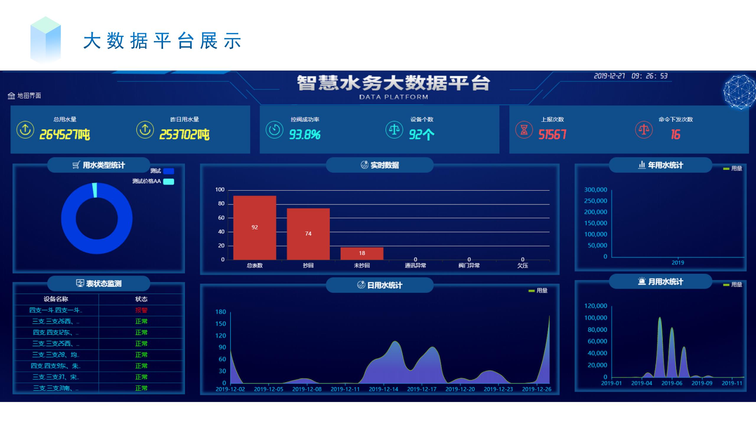 提升水務(wù)管理決策的科學(xué)化水平,利用大數(shù)據(jù)分析能力提升各類業(yè)務(wù)應(yīng)用場景的識別、判斷、管控、執(zhí)行水平,為水安全、水資源、水環(huán)境等決策提供輔助支撐。